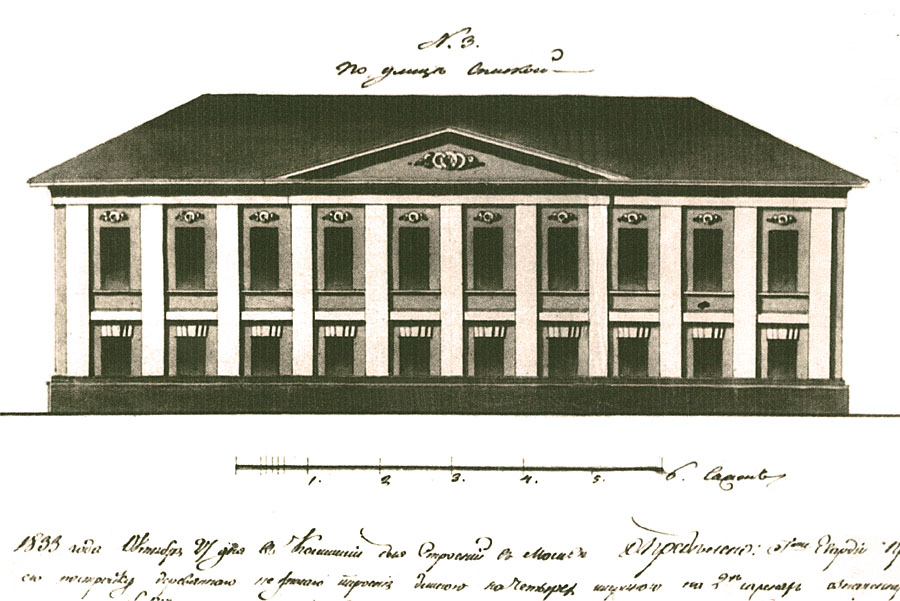 На плане 1833 г. дом каменный, двухэтажный, ритмично разделен лопатками (плоскими пилястрами без капителей) на 10 частей. Центр выделен фронтоном на 4 оси. Над окнами первого этажа помещены веерные замки, а над окнами второго - медальоны с лентами, характерные для стиля ампир.