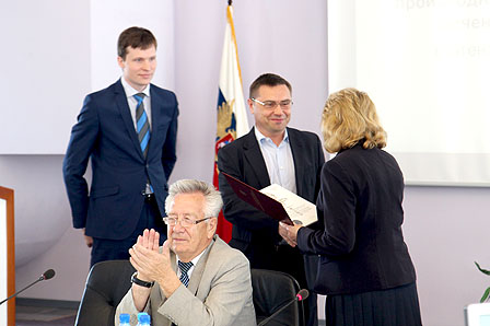 На фото: Диплом вручается В.Е. Небольсину, Генеральному директору «ФАРМИНТЕРПРАЙСЕЗ». Слева - А.В. Журов, Патентный поверенный РФ, Евразийский патентный поверенный ( «Городисский и Партнеры», Москва)